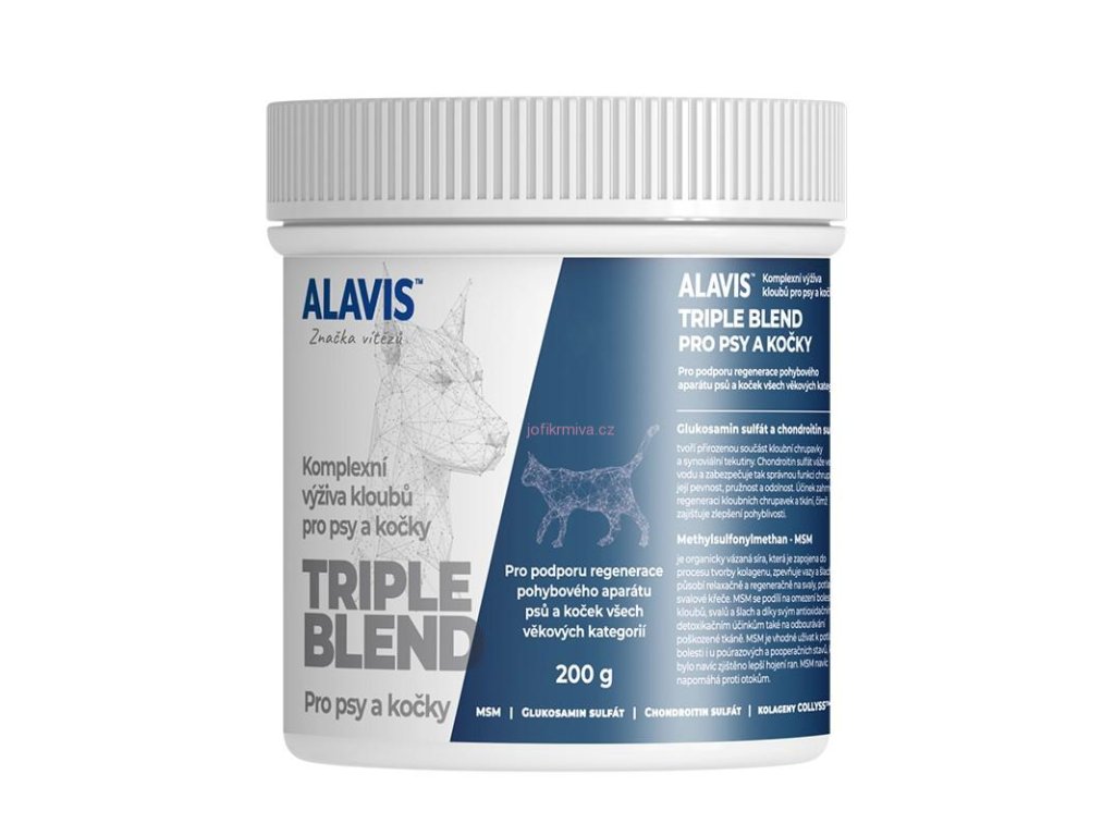 ALAVIS™Triple Blend pro psy a kočky obsahuje kombinaci chondroprotektivních látek (glukosamin sulfátu a chondroitin sulfátu), látky MSM a značkových kolagenů COLLYSS™ a CARTIDYSS™.