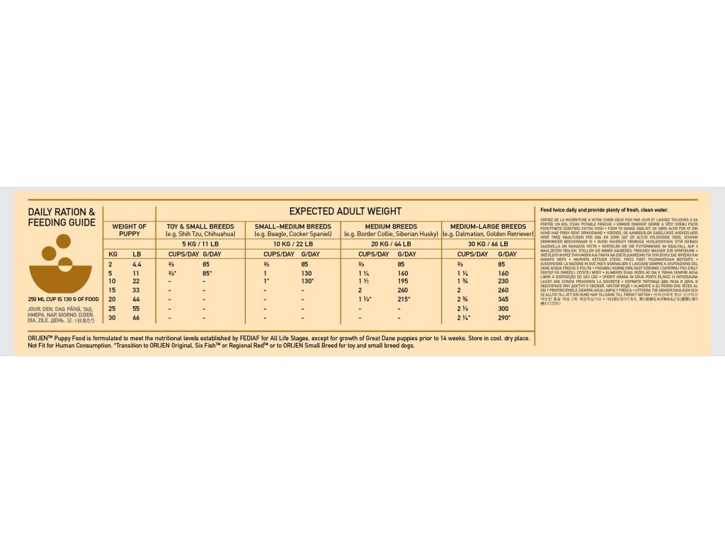 ORIJEN PUPPY překypuje proteiny z volně chovaných kuřat a krůt, ryb lovených v přírodních vodách a vajec z hnízdních chovů, to vše je nám dodáváno čerstvé v bohatě výživném podílu Celé kořisti. Plná živin, které podporují vrcholovou kondici a správný vývoj, zaručí krmiva ORIJEN, že vaše štěně bude zdravé, spokojené a silné.